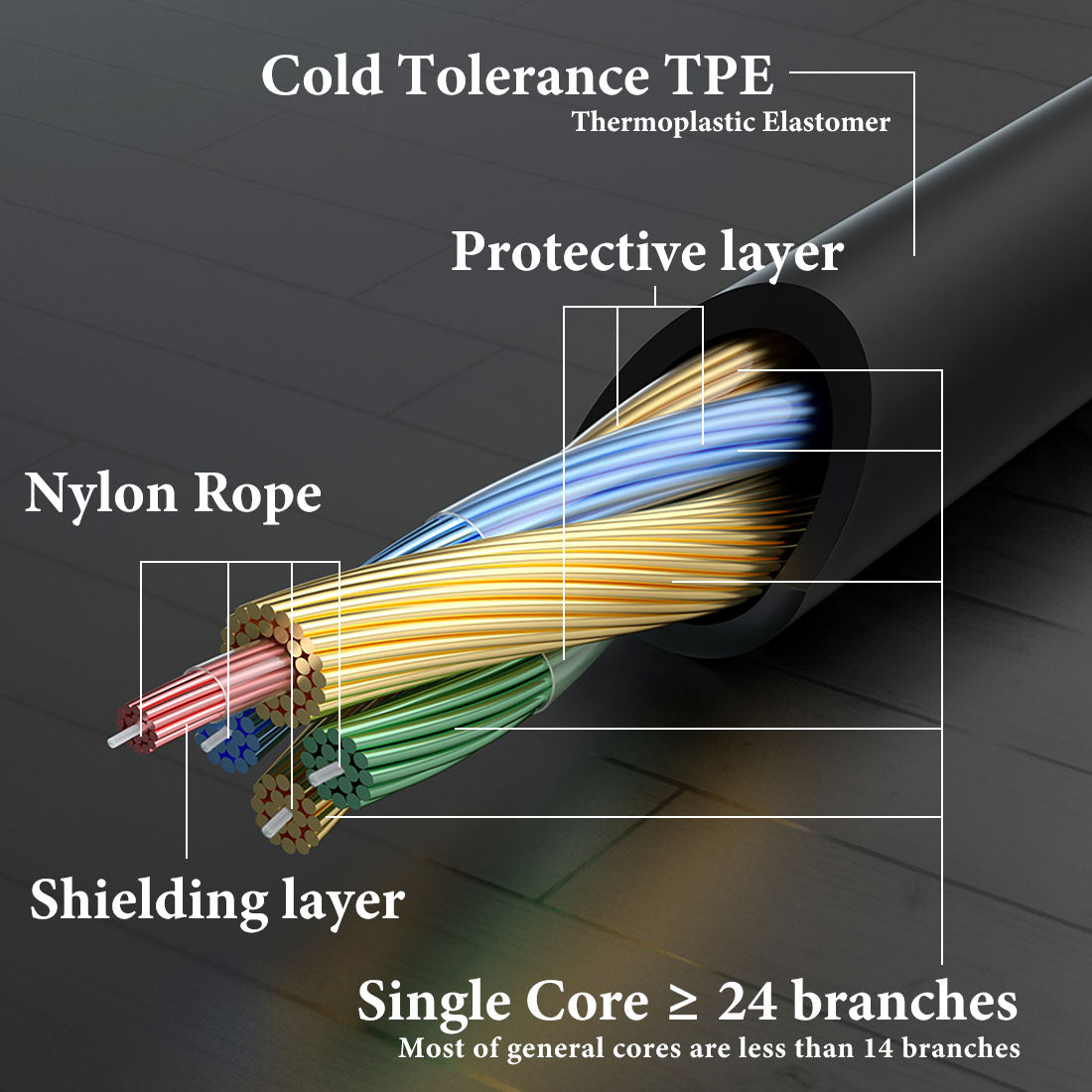 - 熱可塑性エラストマー(TPE)と頑丈に、設計されたポリプロピレンヤーンは 電子磁気または電波干渉(EMI or RFI)に対する優れたオーディオ転送、極度の低温または高温、および最大限の保護を保証します。