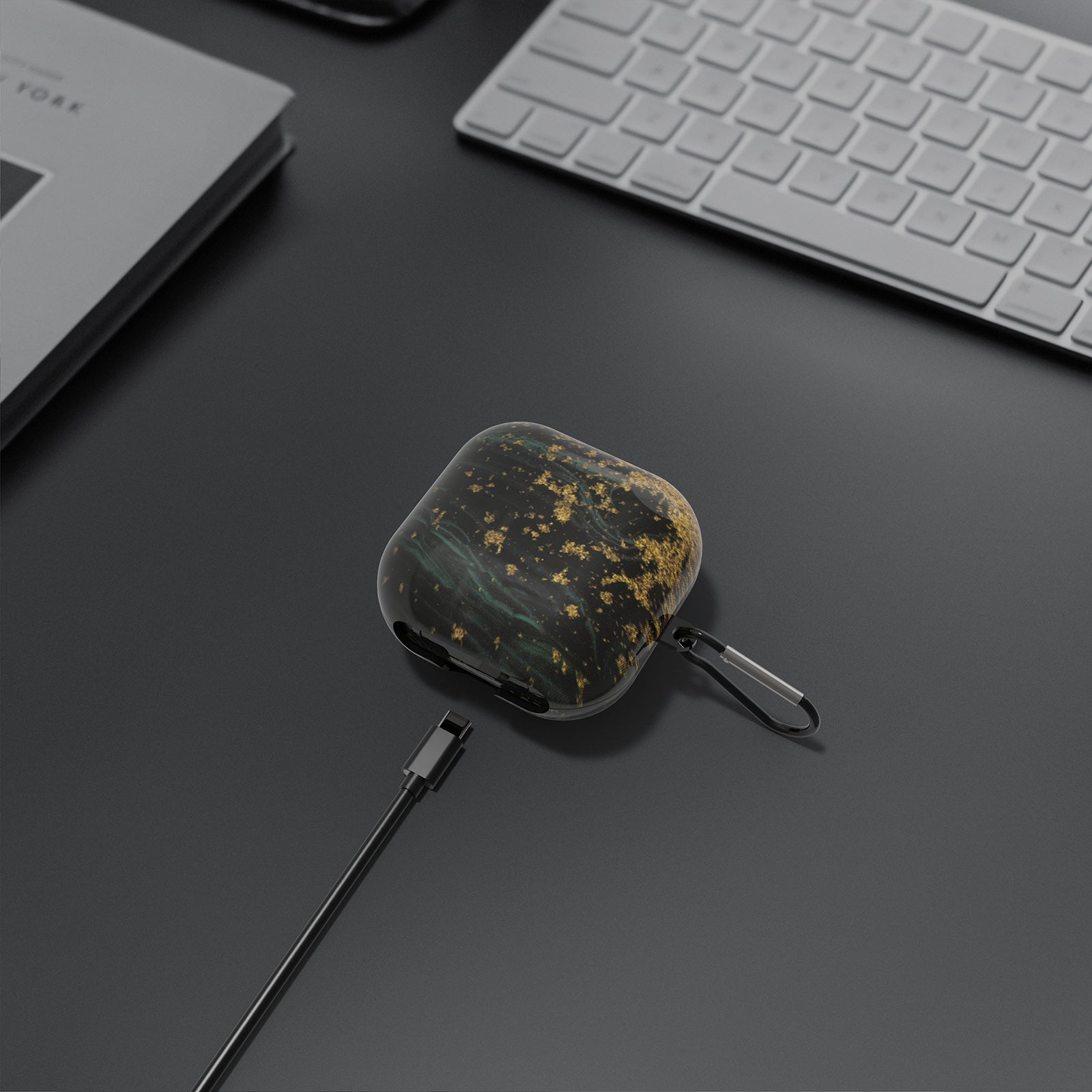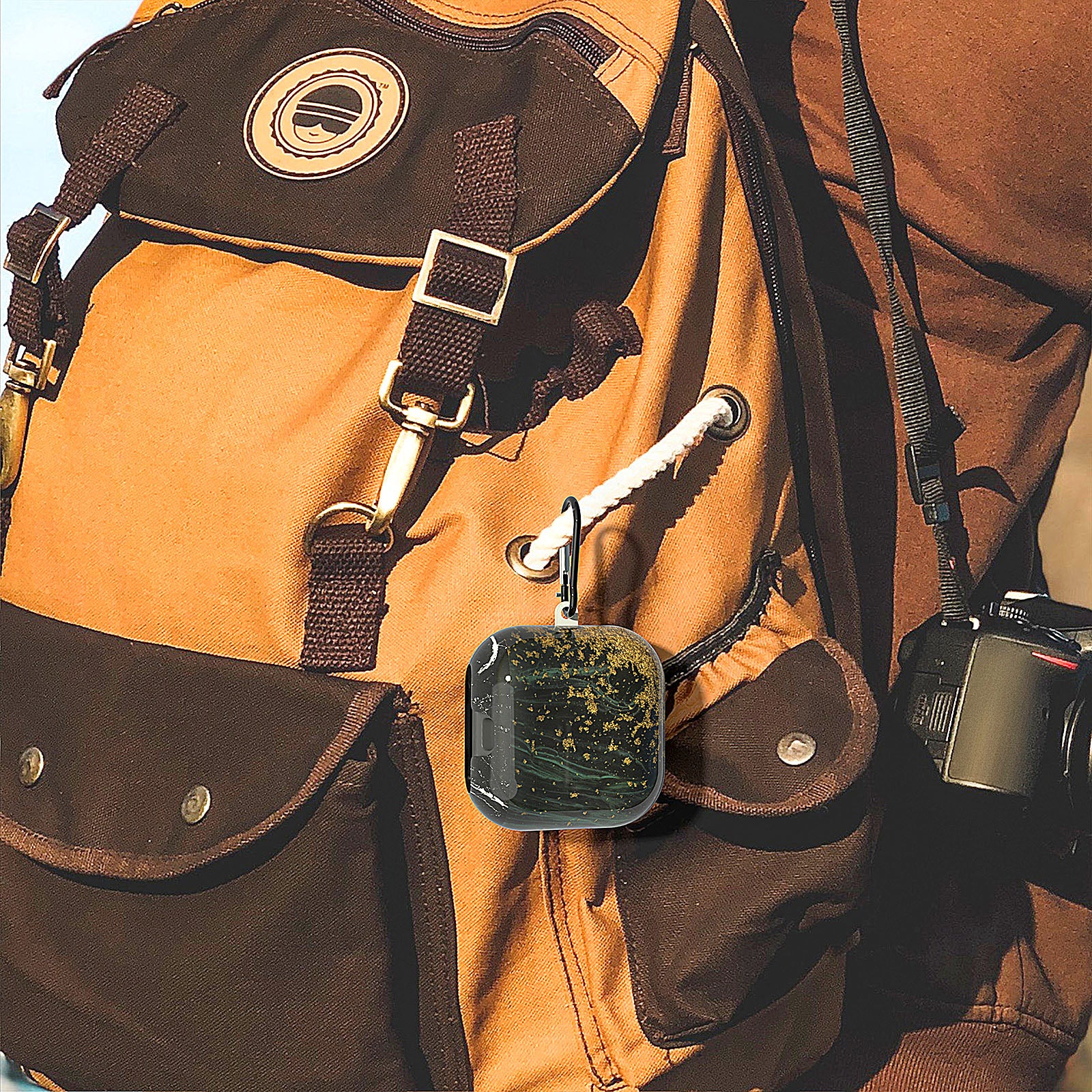 - 内側の粘着ストリップはイヤホンケースが簡単に外れないように設計されています、キーホルダーフック付き、カバーを外さずにイヤホンを充電できるように特別な切り欠きます。