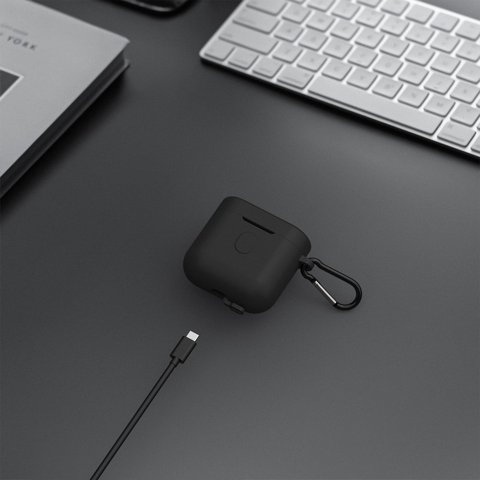 - 内側の粘着ストリップはイヤホンケースが簡単に外れないように設計されています。キーホルダーフック付き、カバーを外さずにイヤホンを充電できるように特別な切り欠きます