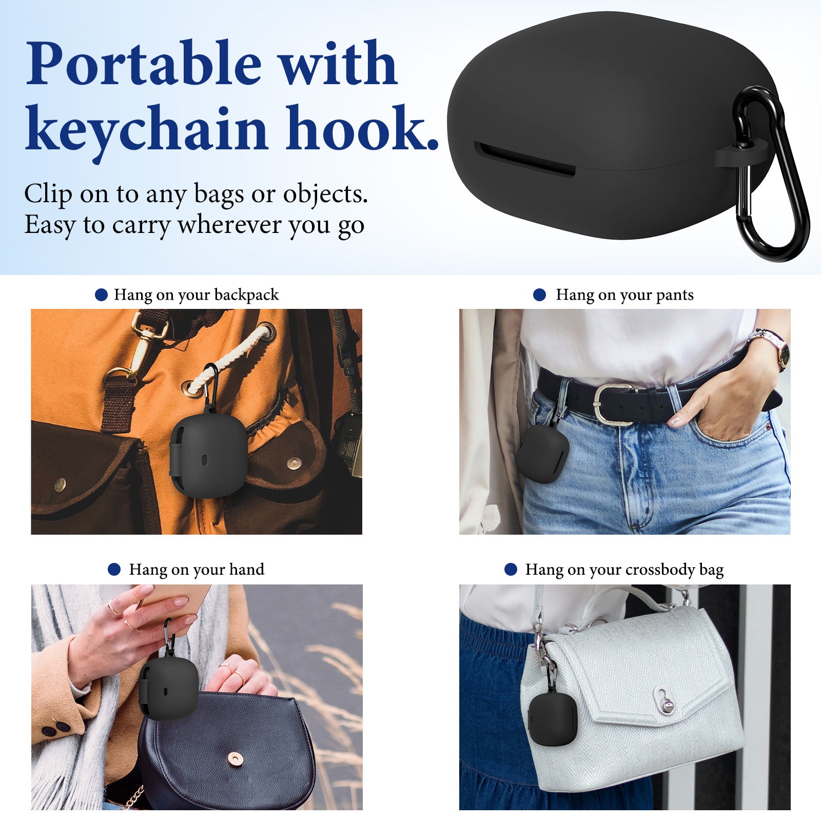 - 内側の粘着ストリップはイヤホンケースが簡単に外れないように設計されています、キーホルダーフック付き 、カバーを外さずにイヤホンを充電できるように特別な切り欠きます